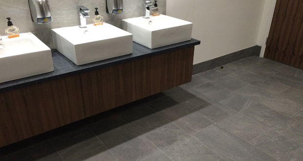 Continues Gary: “In reception, the break-out area on the first floor and all of the toilets, we chose a non-slip, slate-style porcelain floor tile in Felitia Grey from Topps Tiles. Damian sourced the large format ceramic wall tiles, Citysense Moon from the Yorkshire Tile Company for tiling behind the sinks and in the shower enclosures. This combination of ceramic tiles is particularly eye-catching and has given us very stylish washroom facilities!”