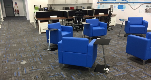 “All of the flooring and wall tiles had to complement the American walnut panelling that was a key feature for the majority of the space and we specified Times Square carpet tiles from Gradus. These specific tiles included grey and blue lines that helped incorporate our corporate colours, and were ideally suited as a flooring solution for the stairs, office spaces, corridors and meeting areas.”